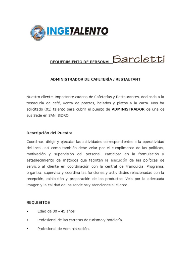 Modelo De Perfil De Puesto Administrador De Cafeteria Servicio Al Cliente Calidad Comercial - Tras estos datos principales, convendria que hicieramos una descripcion un poco mas literaria sobre el producto.